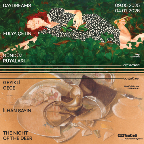 Yapı Kredi Kültür Sanat Yayıncılık, ortak noktaları olan sanatçıları bir araya getiren sergi dizisi “Bir Arada”nın ikincisini düzenliyor. Bu kapsamda düzenlediğimiz sergi turunda ziyaretçilerimiz, Fulya Çetin’in “Gündüz Rüyaları” ve İlhan Sayın’ın “Geyikli Gece” adlı sergilerini sanatçı İlhan Sayın ve sergi küratörü Zehra Begüm Kışla eşliğinde gezme olanağı bulacaklar. 90’lardan bu yana üreten ve aynı kuşağa ait İstanbullu sanatçılar Fulya Çetin ve İlhan Sayın; kent ve doğa manzaraları, hayvan ve insan portreleri, soyutlamalar ve objelerle karşımıza çıkıyorlar. İzleyicinin hayal gücüne alan açan açık uçlu çalışmalar üreten sanatçılar; biçimsel olarak ayrışsalar da sanatsal yaklaşımları ve işledikleri anlamında buluşuyorlar. Ortak noktaları arasında en belirgin olanı, her ikisinin de insanın doğa üzerindeki tahakkümünü düşündüren incelikli eserler üretmeleri. Resim temelli ancak resimle sınırlı kalmayan bu çalışmalarında, izleyiciyi bitki ve hayvanların da özne konumunda olduğu büyülü bir dünyaya çağırıyorlar. Toplumsal cinsiyet eşitsizliği, çevresel adaletsizlikler ve sömürgecilik gibi günümüzün sosyopolitik konuları süzgeçlerinden geçirerek nazik, sade ve kendine özgü bir sanatsal dile çeviriyorlar.